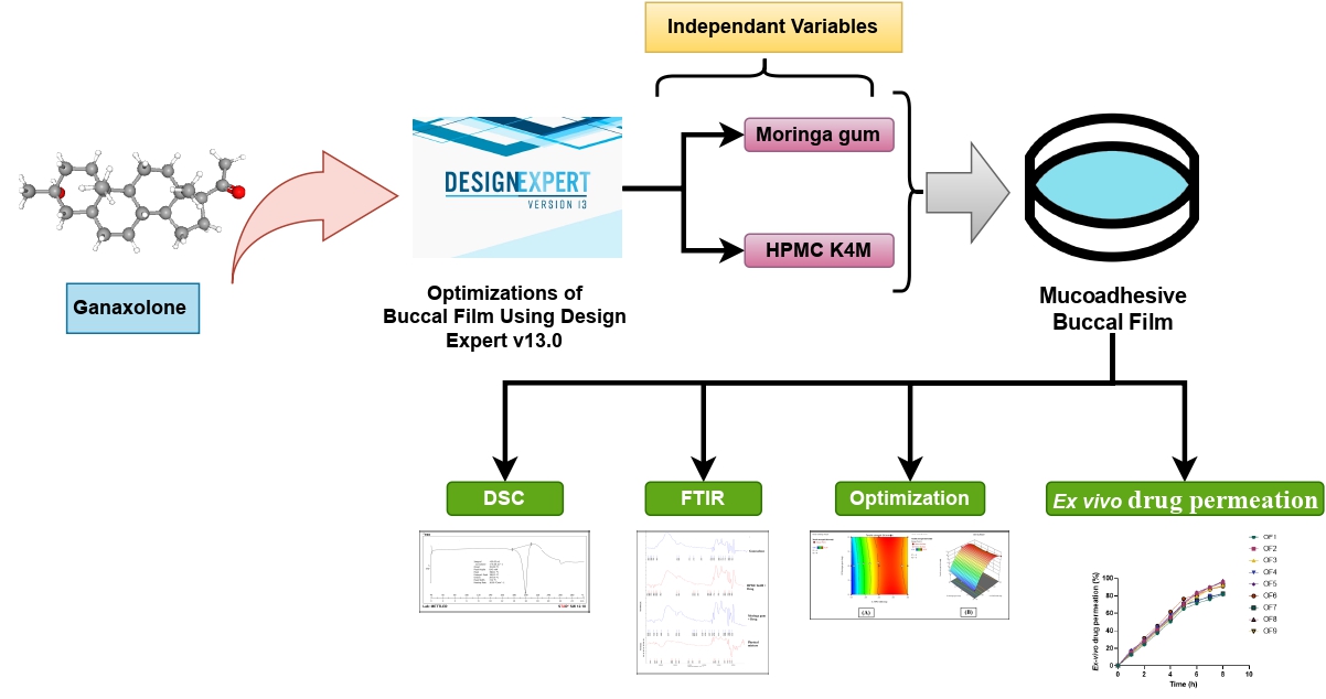 Background: CDD disorder affects children mainly during their first three months of life. The buccal route offers advantages over oral administration for ganaxolone by avoiding first-pass metabolism and providing direct systemic absorption. This study aimed to formulate and characterise mucoadhesive buccal films of ganaxolone to increase its bioavailability. Methods: Mucoadhesive buccal films were prepared using a solvent casting technique employing HPMC K4M and Moringa gum as polymers. The formulation was optimized using a 32-factorial design, where polymer concentrations were varied systematically to achieve optimal film properties. Nine batches (OF1-OF9) were formulated and evaluated for various physicochemical parameters, mucoadhesive strength, percentage drug content, goat buccal mucosa permeation study, and stability analysis. Results: Based on the findings, the OF8 batch containing optimal polymer ratio (250mg HPMC K4M and 60mg Moringa gum) emerged as the superior formulation with 94.45±0.34% drug content, 15.37±0.58 N/mm² tensile strength, and 7.8±0.57 N mucoadhesive strength. Permeation studies consequently confirmed 96.37% of the drug at 8 hours with a 13.63 µg /cm² /h permeation rate. There was no evidence of drug-excipient interaction in FTIR and DSC analysis. The formulation was set to be stable for 6 months at accelerated conditions (40±2°C, 75±5% RH) with an average tensile strength above 15 N/mm² and an average ex-vivo drug permeation of 93%. Conclusion: This optimized buccal film formulation demonstrates promising potential for clinical application in CDD treatment by offering enhanced bioavailability, controlled release, and patient-friendly administration, which is particularly beneficial for pediatric patients.